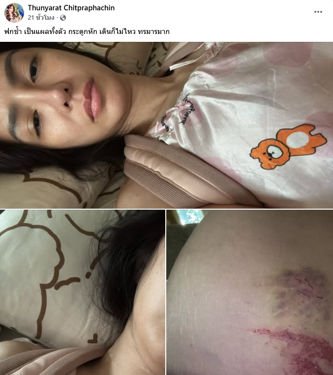 และอีกโพสต์ได้เผยว่า ฟกช้ำ เป็นแผลทั้งตัว กระดูกหัก เดินก็ไม่ไหว ทรมารมาก