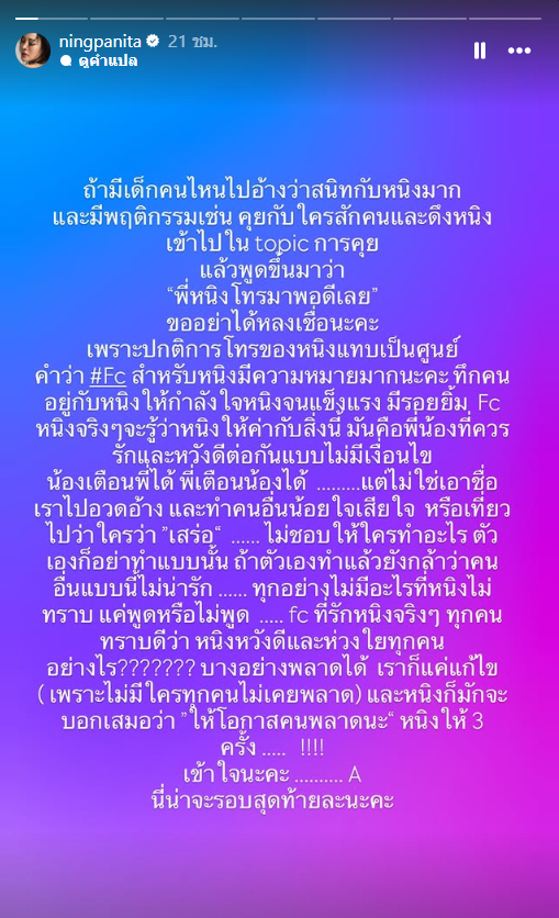 น้องเตือนพี่ได้ พี่เตือนน้องได้ แต่ไม่ใช่เอาชื่อเราไปอวดอ้างและทําคนอื่นน้อยใจเสียใจ หรือ เที่ยวไปว่าใครว่าเสร่อ ไม่ชอบให้ใครทําอะไร ตัวเองก็อย่าทําแบบนั้น ถ้าตัวเองทํา แล้วยังกล้าว่าคนอื่นแบบนี้ไม่น่ารัก ทุกอย่างไม่มีอะไรที่หนิงไม่ทราบ แค่พูดหรือไม่พูด fc ที่รักหนิงจริง ๆ ทุกคนทราบดีว่าหนิงหวังดีและห่วงใยทุกคน
