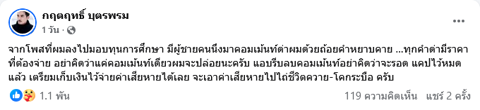 โดย บิ๊กเอ็ม ได้โพสต์ข้อความระบุว่า จากโพสต์ที่ผมลงไปมอบทุนการศึกษา มีผู้ชายคนหนึ่งมาคอมเมนต์ด่าผมด้วยถ้อยคำหยาบคาย ทุกคำด่ามีราคาที่ต้องจ่าย อย่าคิดว่าแค่คอมเมนต์เดียวผมจะปล่อยนะครับ เตรียมเก็บเงินไว้จ่ายค่าเสียหายได้เลย จะเอาค่าเสียหายไปไถ่ชีวิตควาย-โคกระบือครับ