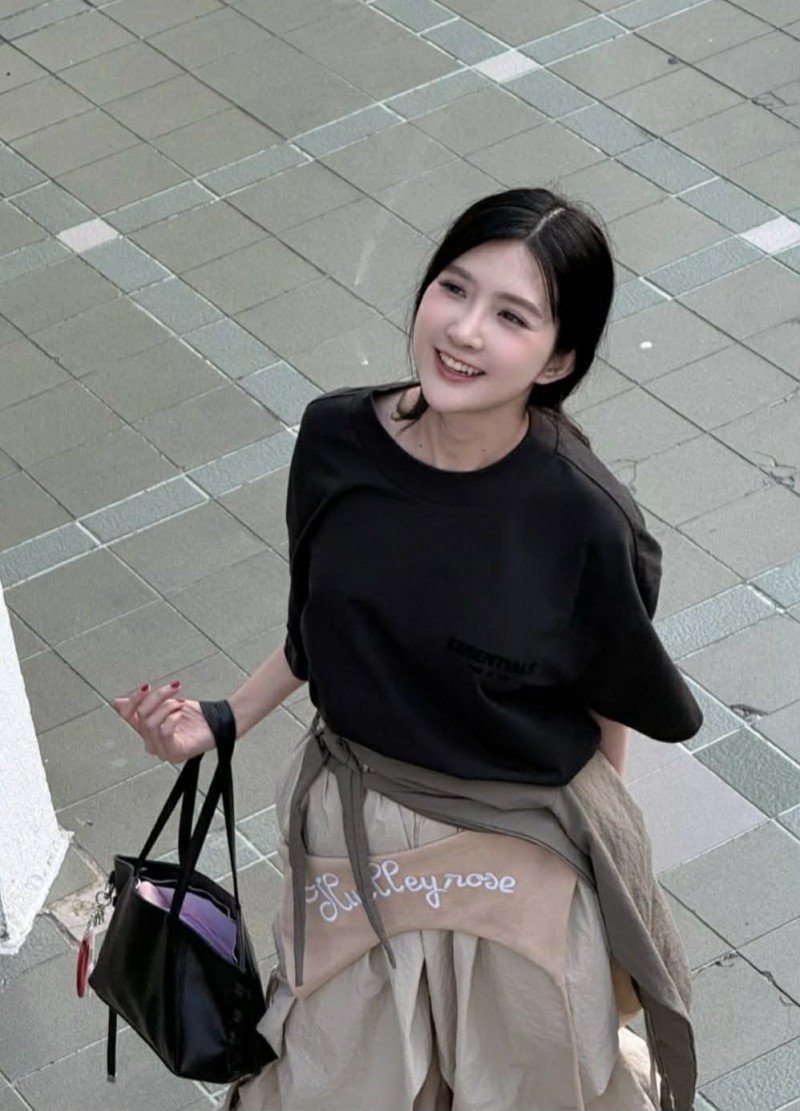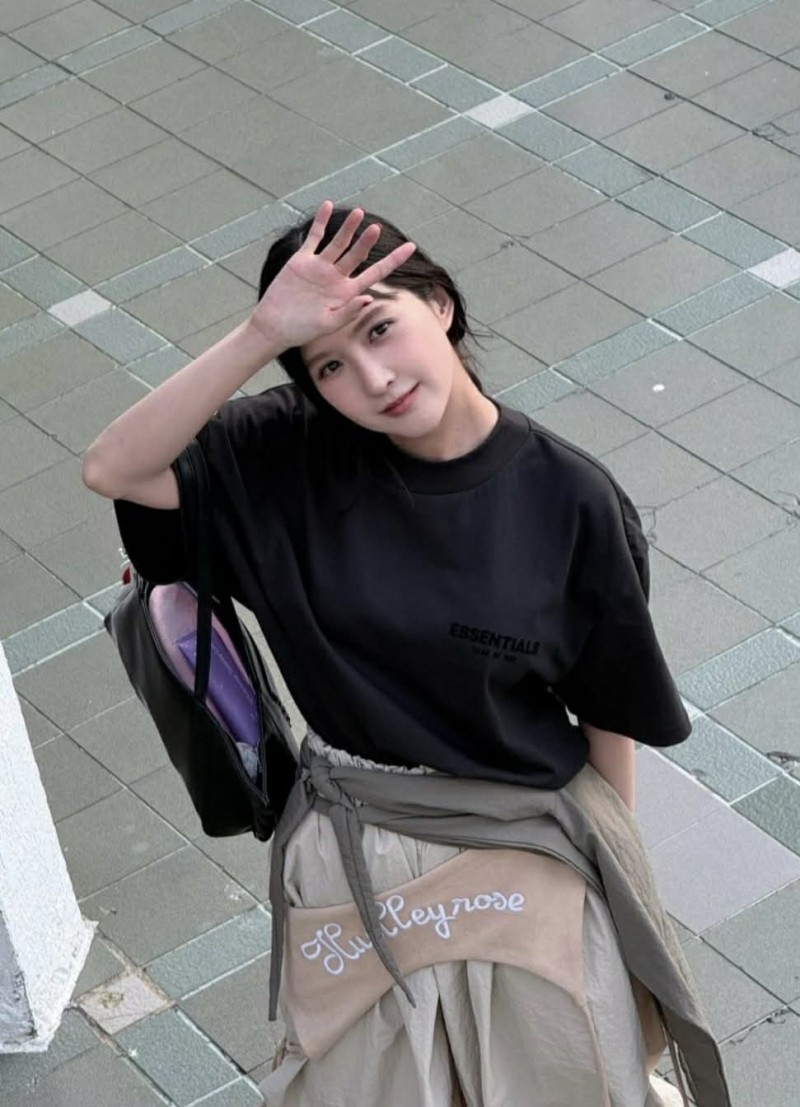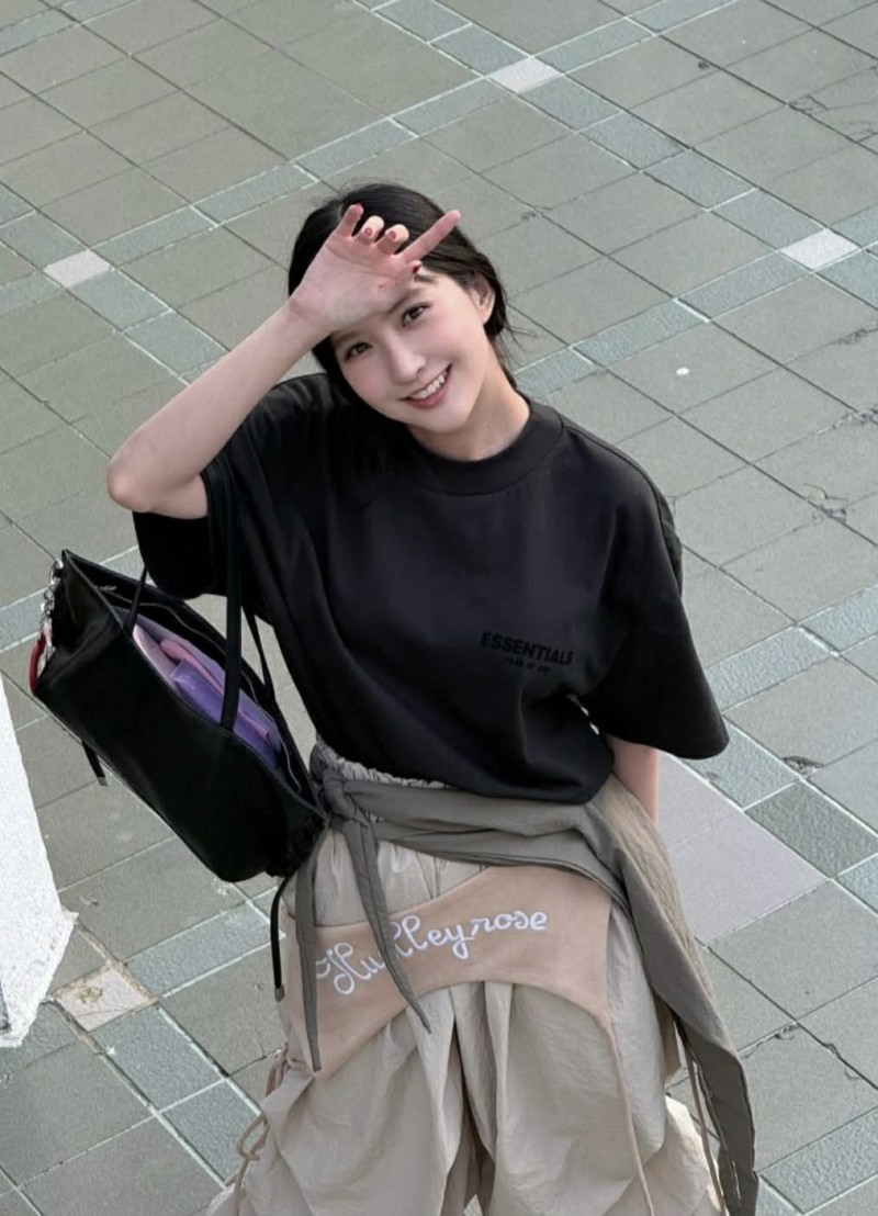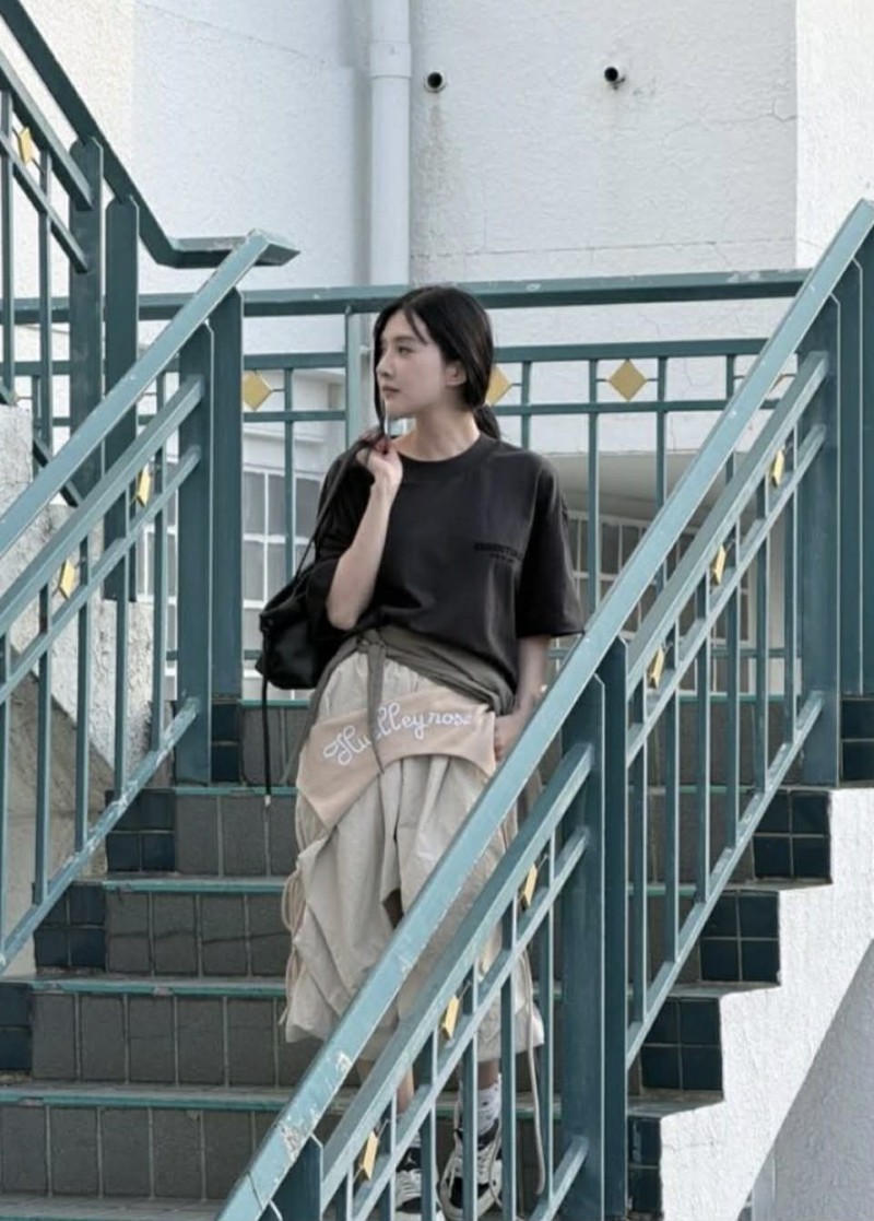 โดย เธอ เลือกหยิบชุดโทนเข้มเรียบง่ายมามิกซ์แอนด์แมตช์ในแบบสตรีทแฟชั่น ทรงเสื้อ และกระโปรงที่ดูหลวมสบายตา ช่วยเพิ่มความเท่แบบไม่ต้องพยายามมาก แต่กลับดูมีเสน่ห์เฉพาะตัว