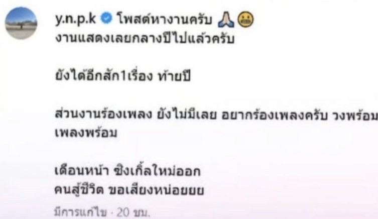 โดย เจ้าตัว เผยว่า ช่วงนี้กำลังเดินหน้าทำเพลงอย่างจริงจัง ทั้งฟอร์มวง และเตรียมปล่อยผลงานใหม่ จึงอยากชวนผู้จัดติดต่อในสายร้องเพลงเพิ่มเติม