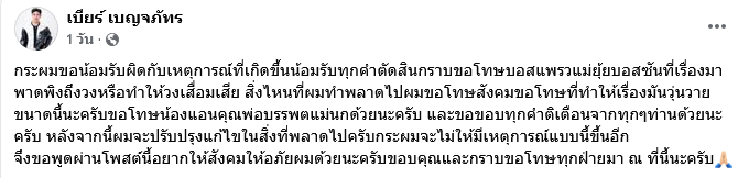 ล่าสุด ทาง เบียร์ เบญจภัทร ได้ออกมาโพสต์แล้วว่า กระผมขอน้อมรับผิดกับเหตุการณ์ที่เกิดขึ้นน้อมรับทุกคำตัดสินกราบขอโทษบอสแพรวแม่ยุ้ยบอสซันที่เรื่องมาพาดพิงถึงวงหรือทำให้วงเสื่อมเสีย สิ่งไหนที่ผมทำพลาดไปผมขอโทษสังคมขอโทษที่ทำให้เรื่องมันวุ่นวายขนาดนี้นะครับขอโทษน้องแอนคุณพ่อบรรพตแม่นกด้วยนะครับ และขอขอบทุกคำติเตือนจากทุกๆท่านด้วยนะครับ หลังจากนี้ผมจะปรับปรุงแก้ไขในสิ่งที่พลาดไปครับกระผมจะไม่ให้มีเหตุการณ์แบบนี้ขึ้นอีก จึงขอพูดผ่านโพสต์นี้อยากให้สังคมให้อภัยผมด้วยนะครับขอบคุณและกราบขอโทษทุกฝ่ายมา ณ ที่นี้นะครับ