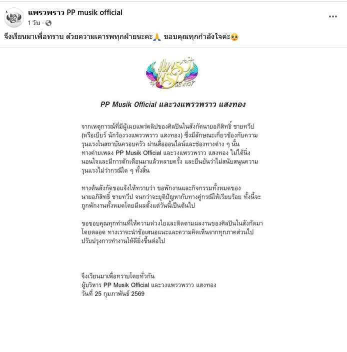 จึงเรียนมาเพื่อทราบโดยทั่วกัน ผู้บริหาร PP Musik Official และวงแพรวพราว แสงทอง วันที่ 25 กุมภาพันธ์ 2569