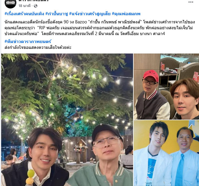 นับว่าเป็นข่าวเศร้าของครอบครัวเเละแฟนๆอย่างมากเมื่อทางด้าน นักแสดงและอดีตนักร้องชื่อดังยุค 90 วง Bazoo กำปั้น กวินพนธ์ พาณิชย์พงส์ โพสต์ข่าวเศร้าการจากไปของคุณพ่อโดยระบุว่า