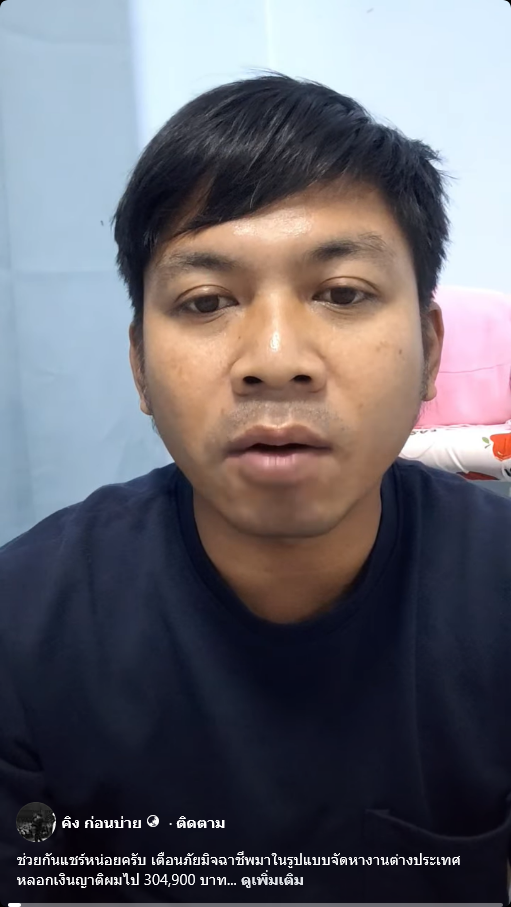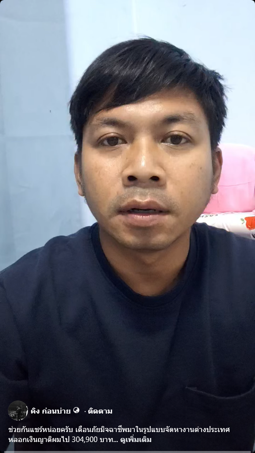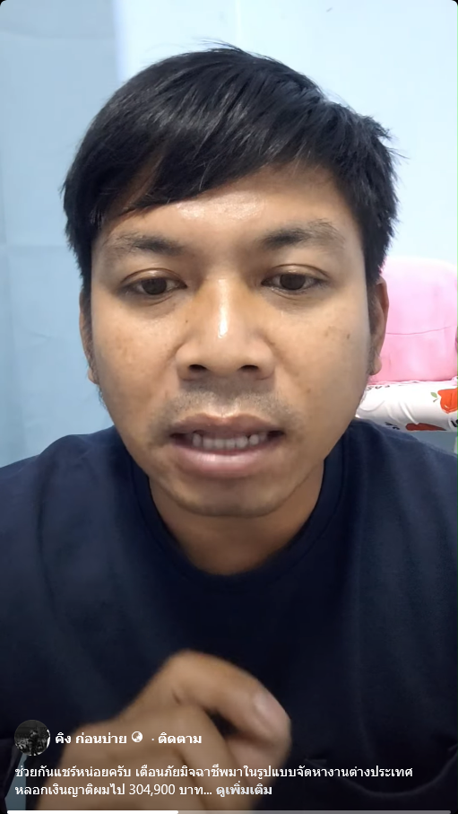 ล่าสุดนักแสดงตลกดัง คิง ก่อนบ่าย โพสต์เตือนภัยหลังจากญาติหลงเชื่อโอนสูญทันที 3 แสน แต่ไม่ได้ไปทำงานต่างประเทศ โดยกล่าวว่า คือมีญาติของผมโดนดูดเงินไปสามแสนกว่าเป็นเรื่องราวของ พี่สาว ภรรยาของผมเองคือเขาอยากจะไปทำงานออสเตรเลีย ก็ไปเข้าเวบไซต์หนึ่ง แล้วก็ให้เข้าไลน์กลุ่ม