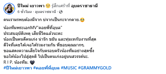 คนเรามรพบต้องมีจาก บ่จากเป็นกะจากตาย น้องทีมพระเอกMV คอยพี่ที่อุบล ประสบอุบัติเหตุ เสียชีวิตแล้วนะคะ น้องเป็นคนดีคนเก่ง น่ารัก ขยัน และทุ่มเทกับงานที่สุด ดีใจที่เคยได้เจอได้ร่วมงามกัน พี่ขอบคุณมากๆ ขอแสดงความเสียใจกับครอบครัวน้องทีมอย่างสุดซึ้ง ขอให้น้องไปสู่สุคติ ไปเป็นคนเก่งอยู่บนสวรรค์นะ R I P. น้องทีม
