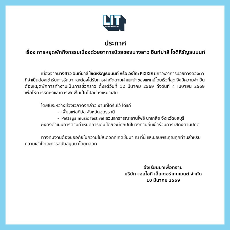 อย่างไรก็ตาม กิจกรรมของวงจะยังคงดำเนินการตามกำหนดการเดิม โดยจะยังมีศิลปินในวงท่านอื่นเข้าร่วมกิจกรรม ทั้งนี้หากมีความคืบหน้าประการใด ทางทีมงานจะแจ้งให้ทราบอีกครั้ง บริษัท แอลไอที เอ็นเตอร์เทนเมนต์ จำกัด วันที่ 10 มีนาคม 2569