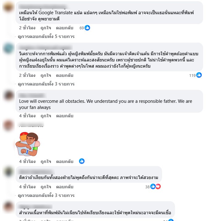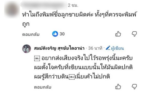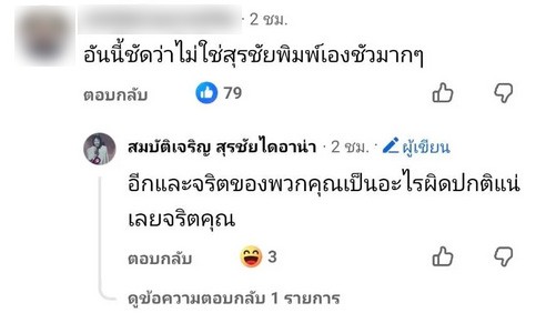 รวมทั้งมีคอมเมนต์ที่จับผิดว่าดูเหมือนโพสต์ดังกล่าวจะไม่ใช่สรุชัยโพสต์เอง ทำเอาเจ้าตัวสวนกลับทันทีว่า อีกและจริตของพวกคุณเป็นอะไรผิดปกติแน่เลยจริตคุณ และอื่นๆอีกมากมาย