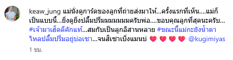 โดยแม่แก้วเขียนแคปชั่นว่า แม่นั่งดูการ์ดของลูกที่ถ่ายส่งมาให้ครั้งแรกที่เห็น แม่ก็เป็นแบบนี้ยิ่งดูยิ่งปลื้มปริ่มมมมมมมครับพ่อ ขอบคุณลูกที่สุดนะครับ#เจ้ามาเฮ็ดดีคักแท้ สมกับเป็นลูกอิสานหลาย #ขณะนี้แม่กะยังน้ำตาไหลปลื้มปริ่มอยู่บ่อเซา จนสิเซาเบิ่งแมนบ่