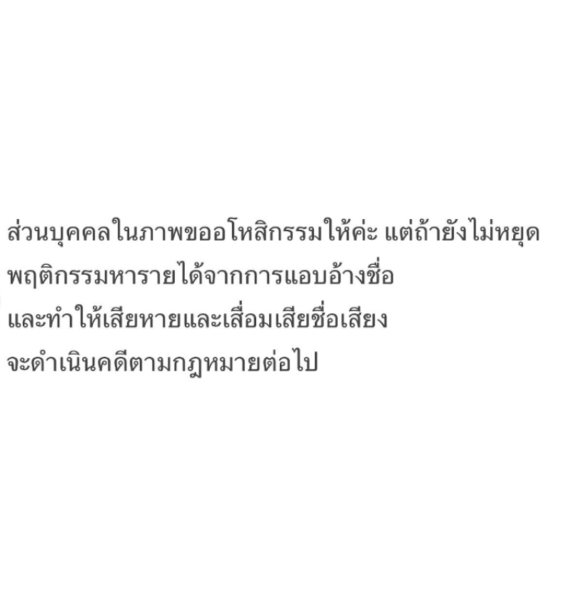 และมีข้อความเพิ่มว่า ด้านบุคคลในภาพขออโหสิกรรมให้ค่ะ แต่ถ้ายังไม่หยุดพฤติกรรมหารายได้จาการแอบอ้างชื่อและทำให้เสียหายและเสื่อมเสียชื่อเสียง จะดำเนินคดีตามกฎหมายต่อไป