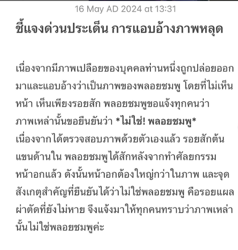 เนื่องจากมีภาพเปลือยของบุคคลท่านหนึ่งถูกปล่อยออกมาและแอบอ้างว่าเป็นภาพของพลอยชมพู โดยที่ไม่เห็นหน้า เห็นเพียงรอยสัก พลอยชมพูขอชี้แจงทุกคนว่า ภาพเหล่านั้นขอยืนยันว่า ไม่ใช่! พลอยชมพู เนื่องจากได้ตรวจสอบภาพด้วยตนเองแล้ว รอยสักต้นแขนด้านใน พลอยชมพูได้สักหลังจากทำศัลยกรรมหน้าอกแล้ว ดังนั้นหน้าอกต้องใหญ่กว่าในภาพ และจุดสังเกตสำคัญที่ยืนยันได้ว่าไม่ใช่พลอยชมพู คือรอยแปลผ่าตัดที่ยังไม่หาย จึงแจ้งมาให้ทุกคนทราบว่าภาพดังกล่าวไม่ใช่พลอยชมพูค่ะ