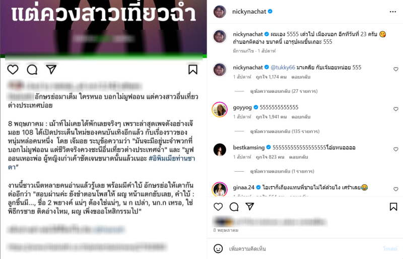 จากกรณีที่ก่อนหน้านั้น ทางดาราหนุ่ม อย่าง นิกกี้ ณฉัตร ได้ออกมายอมรับจากข่าว โดยโพสต์ผ่านทางอินสตาแกรม โดยได้บอกว่า ผมเอง 5555 เดี๋ยวไป เมืองนอก อีกทีวันที่ 23 ครับ ถ้าบอกติดอ่าง ขนาดนี้ เอารูปผมขึ้นเถอะ 555 ซึ่งในข่าวได้เผยว่าดาราหนุ่มยังไม่มูฟออน แต่ชีวิตจริงกลับย้อนแย้ง เพราะควงสาวอื่นเที่ยวต่างประเทศฉ่ำ ล่าสุดเจ้าตัวพูดถึงเรื่องนี้พร้อมเผยว่าจริงๆ มูฟออนนานแล้ว