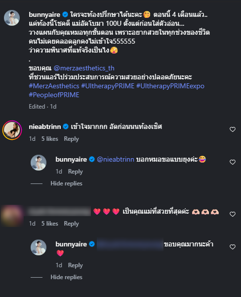 เรียกได้ว่า กลายเป็นคุณแม้ลูก2แล้ว สำหรับ แอร์ ภัณฑิลา ที่ก่อนหน้านั้น เพิ่งประกาศตั้งท้องลูกคนที่2ไปนั้นเอง ล่าสุด แม่แอร์ได้โพสต์รูป พร้อมแคปชั่นว่า ใครจะท้องปรึกษาได้นะคะ ตอนนี้ 4 เดือนแล้ว.. แค่ท้องนี้โชคดี แม่อัดโบมา 100U ตั้งแต่ก่อนใส่ตัวอ่อน… วางแผนกับคุณหมอทุกขั้นตอน เพราะอยากสวยในทุกช่วงของชีวิต คนไม่เคยคลอดลูกคงไม่เข้าใจ555555 ว่าความพินาศที่แท้จริงเป็นไง