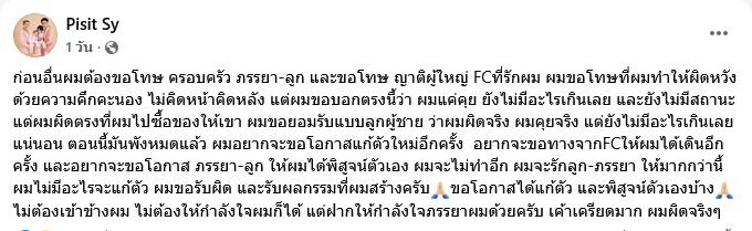 ด้วยความคึกคะนอง ไม่คิดหน้าคิดหลัง แต่ผมขอบอกตรงนี้ว่า ผมแค่คุย ยังไม่มีอะไรเกินเลย และยังไม่มีสถานะ แต่ผมผิดตรงที่ผมไปซื้อของให้เขา ผมขอยอมรับแบบลูกผู้ชาย ว่าผมผิดจริง ผมคุยจริง แต่ยังไม่มีอะไรเกินเลยแน่นอนตอนนี้มันพังหมดแล้ว ผมอยากจะขอโอกาสแก้ตัวใหม่อีกครั้ง