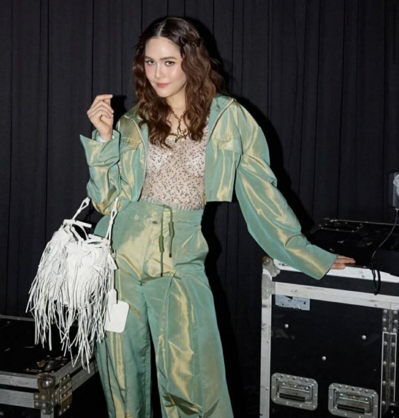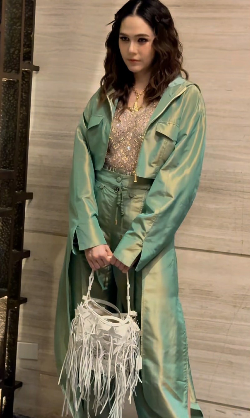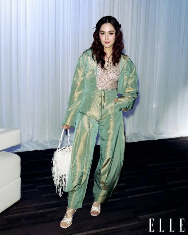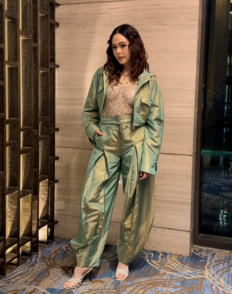 ลุคนี้โดดเด่นด้วยโทนสีเขียวแวววาวสะท้อนแสง ให้ฟีลสดจัดจ้าน แต่ยังคงความหรูในแบบแฟชั่นชั้นสูง
