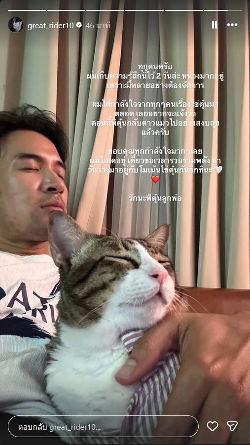 เพราะมีหลายอย่างต้องจัดการ ผมได้กำลังใจจากทุกๆคนเรื่องไข่ตุ๋นมา ตลอด เลยอยากจะแจ้งว่า ตอนนี้พี่ตุ๋นกลับดาวแมวไปอย่างสงบสุข แล้วครับ ขอบคุณทุกกำลังใจมากๆเลย ผมโอเคอยู่ เดี๋ยวขอเวลารวบรวมพลัง หา วันว่างมาอยู่กับโมเม้นไข่ตุ๋นกันอีกทีนะ รักนะพิตุ่นลูกพ่อ