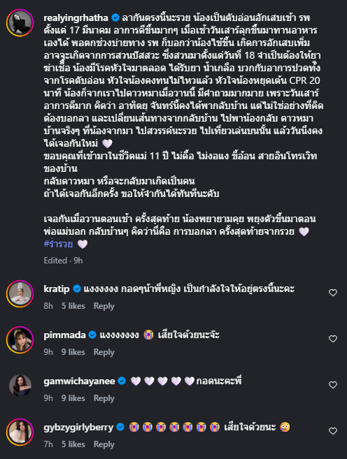 เรียกได้ว่า ทำเอานักแสดงสาว อย่าง หญิง รฐา ต้องฌสร้่าหนัก หลังสูญเสียน้องหมาสุดที่รักไป โดยล่าสุด ได้ออกมาแจ้งข่าวว่าน้องจากไปแล้ว พร้อมระบุว่า ลากันตรงนี้นะรวย น้องเป็นตับอ่อนอักเสบเข้า รพ ตั้งแต่ 17 มีนาคม อาการดีขึ้นมากๆ เมื่อเช้าวันเสาร์ลุกขึ้นมาทานอาหารเองได้ พอตกช่วงบ่ายทาง รพ ก็บอกว่าน้องไข้ขึ้น เกิดการอักเสบเพิ่มอาจจะเกิดจากการสวนปัสสวะ ซี่งสวนมาตั้งแต่วันที่ 18 จำเป็นต้องให้ยาฆ่าเชืื้อ น้องมีโรคหัวใจมาตลอด ได้รับยา น้ำเกลือ บวกกับอาการปวดท้ิงจากโรคตับอ่อน หัวใจน้องคงทนไม่ไหวแล้ว หัวใจน้องหยุดเต้น CPR 20 นาที น้องก็จากเราไปดาวหมาเมื่อวานนี้ มีคำถามมากมาย เพราะวันเสาร์อาการดีมาก คิดว่า อาทิตยฺ จันทร์นี้คงได้พากลับบ้าน แต่ไม่ใช่อย่างที่คิด ต้องบอกลา และเปลี่ยนเส้นทางจากกลับบ้าน ไปพาน้องกลับ ดาวหมา บ้านจริงๆ ที่น้องจากมา ไปสวรรค์นะรวย ไปเที่ยวเล่นบนนั้น แล้ววันนึงคงได้เจอกันใหม่