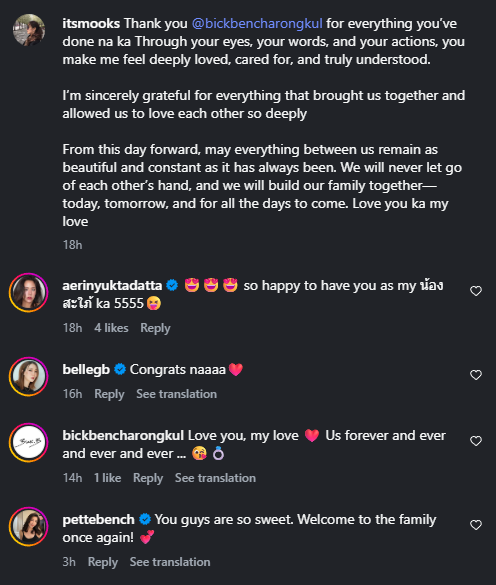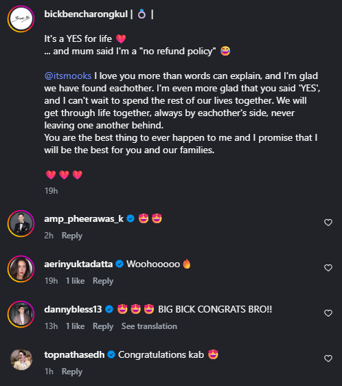 และทางแฟนสาว ก็ได้โพสต์ว่า Thank you @bickbencharongkul for everything you’ve done na ka Through your eyes, your words, and your actions, you make me feel deeply loved, cared for, and truly understood. I’m sincerely grateful for everything that brought us together and allowed us to love each other so deeply From this day forward, may everything between us remain as beautiful and constant as it has always been. We will never let go of each other’s hand, and we will build our family together—today, tomorrow, and for all the days to come. Love you ka my love