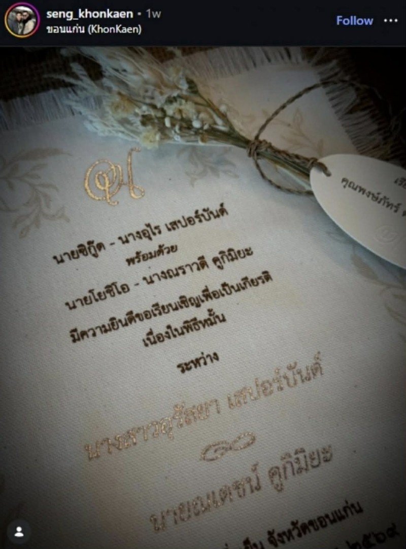เรียกได้ว่า ทำเอาแฟนๆ ตื่นเต้นกันสุดๆ เมื่อ คุณเซ็ง ขอนแก่น โพสต์ภาพการ์ดเชิญงานแต่งงานของคู่รักซุปตาร์ ณเดชน์ คูกิมิยะ และ ญาญ่า อุรัสยา การ์ดมาในสไตล์เรียบหรู พร้อมข้อความหวาน With love, Barry & Yaya โดยมีฉากหลังเป็นบรรยากาศริมทะเลสุดโรแมนติก