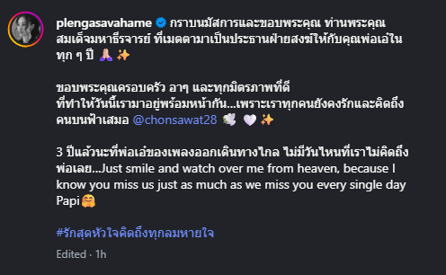 3 ปีแล้วนะที่พ่อเอ๋ของเพลงออกเดินทางไกล ไม่มีวันไหนที่เราไม่คิดถึงพ่อเลย…Just smile and watch over me from heaven, because I know you miss us just as much as we miss you every single day Papi #รักสุดหัวใจคิดถึงทุกลมหายใจ