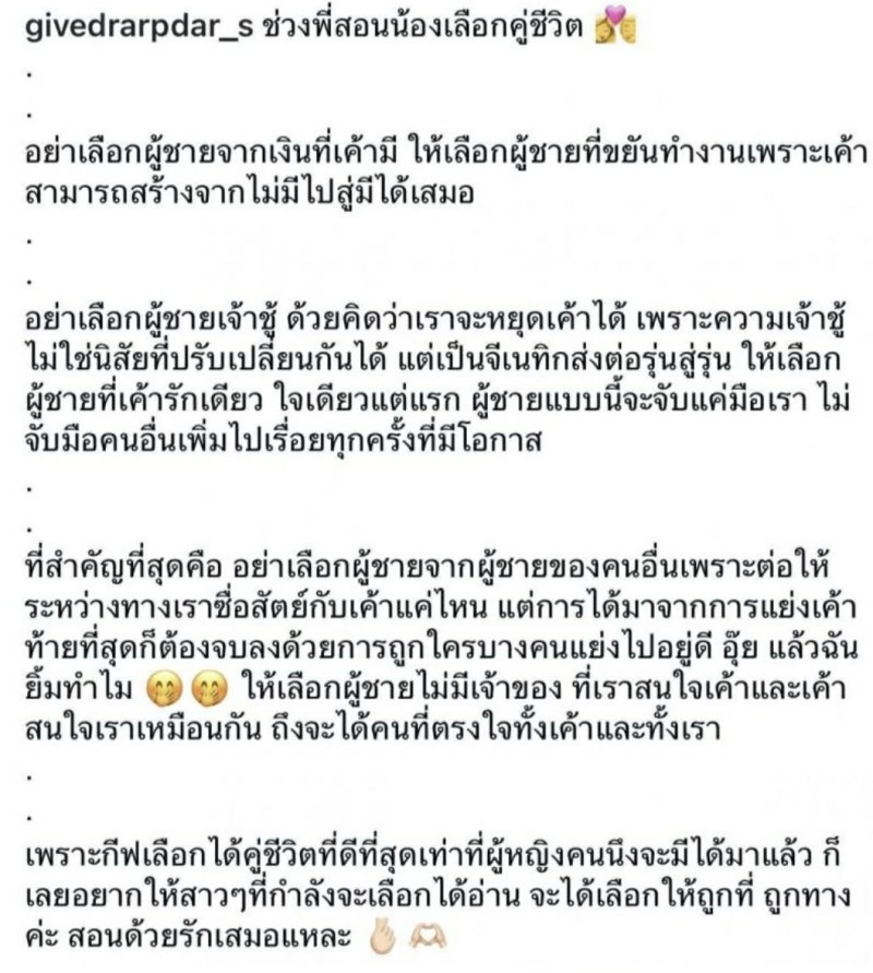 พร้อมย้ำว่า ประสบการณ์ชีวิตทำให้ เธอ เชื่อในสิ่งนี้ และอยากส่งต่อเป็นข้อคิดให้ผู้หญิง เลือกความรักอย่างรอบคอบ