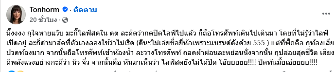 งานี้ทำเอาแฟนๆต่างฮาลั่นเมื่อ ต้นหอม ศกุนตลา เทียนไพโรจน์ ได้ออกมาเล่าเรื่องราวที่ทำเอาเจ้าตัวใจหายเมื่อได้เข้าห้องน้ำขณะที่ตัวเองลืมปิดไลฟ์สด ว่า มึ๊งงงง กุใจหายแว๊บ มะกี๊ไลฟ์สดใน ตต ละคิดว่ากดปิดไลฟ์ไปแล้ว ก็ถือโทรศัพท์เดินไปเดินมา