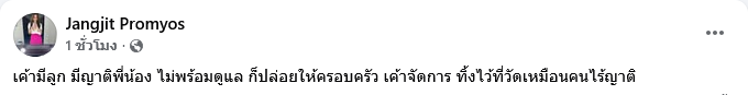 ทำเอาชาวเน็ตตาลุกเมื่อล่าสุด แจง ปุณณาสา ภรรยาแจ๊ส ชวนชื่น ได้ออกมาโพสต์ข้อความผ่านทางเฟซบุ๊คส่วนตัว Jangjit Promyos ระบุว่า เค้ามีลูก มีญาติพี่น้อง ไม่พร้อมดูแล ก็ปล่อยให้ครอบครัว เค้าจัดการ ทิ้งไว้ที่วัดเหมือนคนไร้ญาติ