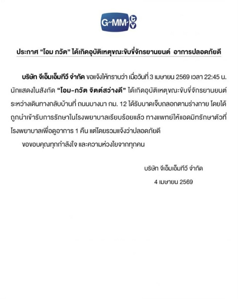 โดย ต้นสังกัด โพสต์เผยว่า เจ้าตัว มีบาดแผลตามร่างกายหลายแห่ง แต่ยังอยู่ในความดูแลของทีมแพทย์อย่างใกล้ชิด