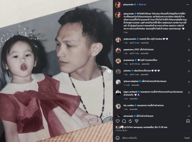 เรียกไดว่า เป็นนักแสดงมากฝีมือ สำหรับ พลอย รัญดภา ที่ล่าสุด ได้ออกมาโพสต์แจ้งข่าวเศร้า โดยได้เผยว่า ยังไม่ทันได้หอม ได้กอดลากันเลยรีบไปดูปู่กับย่าใช่มั้ย? ช่วงนี้พลอยร้องไห้เยอะหน่อยนะ แต่ไม่ต้องห่วงจะกลับมาเข้มแข็งไวๆ เดินทางรอบนี้ไปไกลเลยนะป๊าโทหาก็ไม่ได้ รักที่ป๊าให้ทุกคนมันมีค่าและยิ่งใหญ่มากเลยนะ อยู่ข้างบนก็ขอให้ป๊ามีความสุขเยอะๆ ทุกข์มาหลายปีแล้ว ป๊ารู้อยู่แล้วแหละว่าพลอยรักป๊ามากขนาดไหน หมดห่วง หลับให้สบาย แล้วเจอกันใหม่นะ พลอยภูมิใจในตัวป๊าเสมอ คนเก่งของลูก