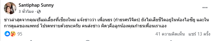 ล่าสุด เฟซบุ๊คที่ชื่อว่า ไพโรจน์ สุดใจทวีผล โดยมีการรีโพสต์ข้อความจากเฟซบุ๊ก Santiphap Sunny เล่าว่า ข่าวล่าสุดจากคุณจุรีแม่เลี้ยงที่เชียงใหม่ แจ้งข่าวว่า เพื่อนธร (กำธรศรวิจิตร) ยังไม่เสียชีวิตอยู่ในห้องไอซียู และในการดูแลของแพทย์ โปรดทราบด้วยนะครับ คนส่งข่าว ผิดๅคือลูกน้องคุณกำธรเพื่อนเราเอง