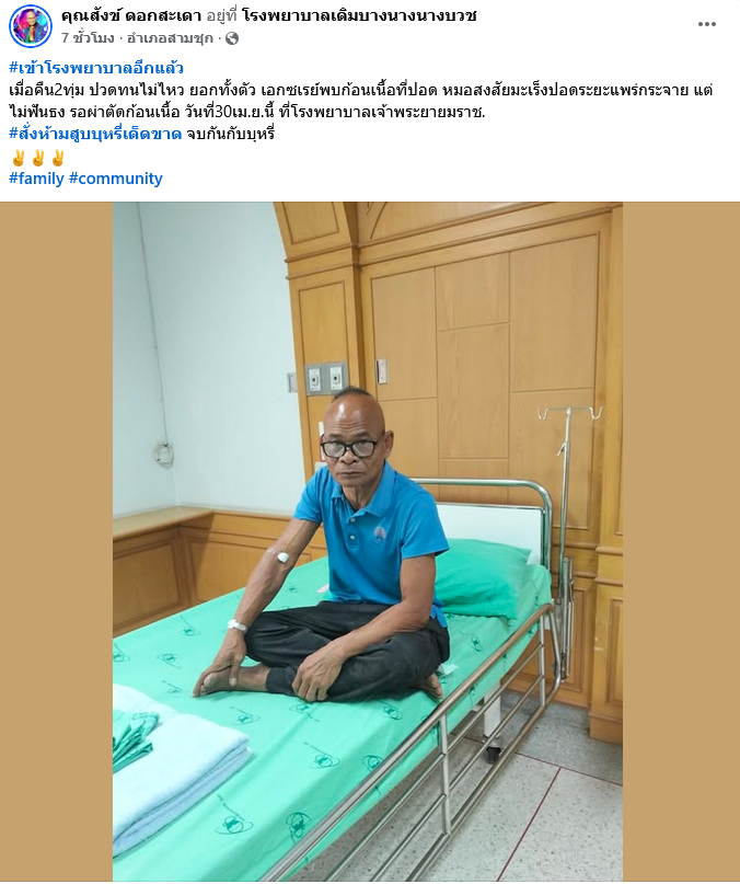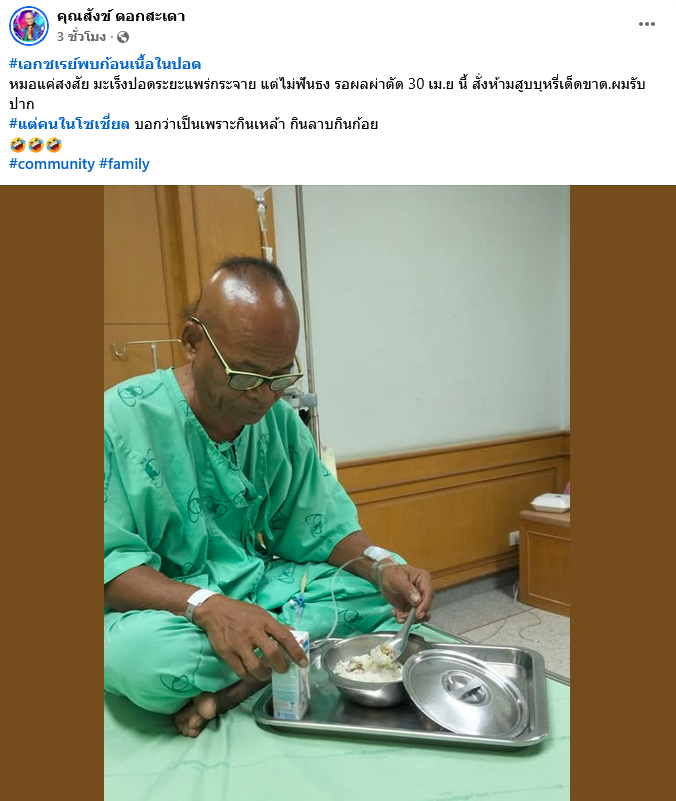 ต่อมา โพสต์ข้อความอัปเดตว่า “เอกซเรย์พบก้อนเนื้อในปอด หมอแค่สงสัย มะเร็งปอดระยะแพร่กระจาย แต่ไม่ฟันธง รอผลผ่าตัด 30 เม.ย นี้ สั่งห้ามสูบบุหรี่เด็ดขาด ผมรับปาก #แต่คนในโซเชียล บอกว่าเป็นเพราะกินเหล้า กินลาบกินก้อย