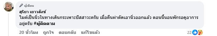 พร้อมทั้งเขียนรายละเอียดเพิ่มเติมว่า ไมค์เป็นนิ่วในทางเดินกระเพาะปัสสาวะครับ เมื่อคืนผ่าตัดเอานิ่วออกแล้ว ตอนนี้นอนพักรอดูอาการอยู่ครับ ท่ามกลางแฟนๆต่างส่งกำลังใจกันอย่างมาก