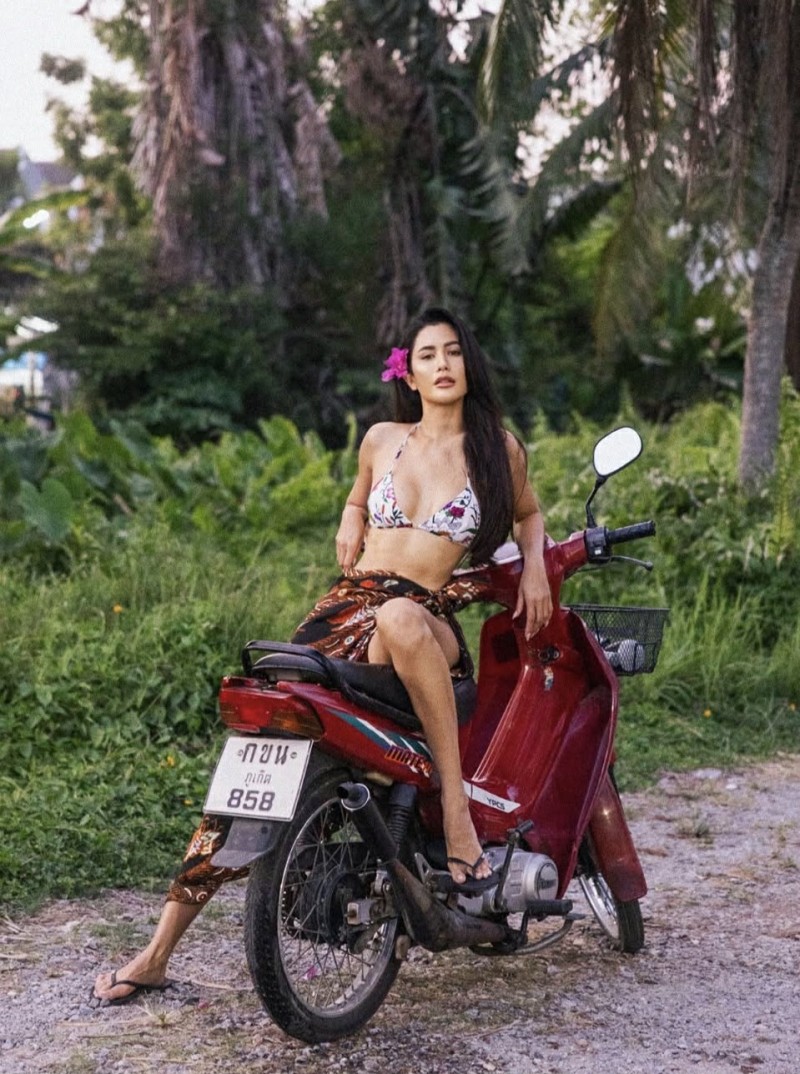 ไม่เพียงเท่านั้น เธอ ยังเพิ่มความโดดเด่นด้วยการโพสท่าบนมอเตอร์ไซค์วินเทจคันเก่า ทำให้ภาพเซ็ตนี้ มีทั้งความเท่ และความแซ่บผสมกันอย่างลงตัว