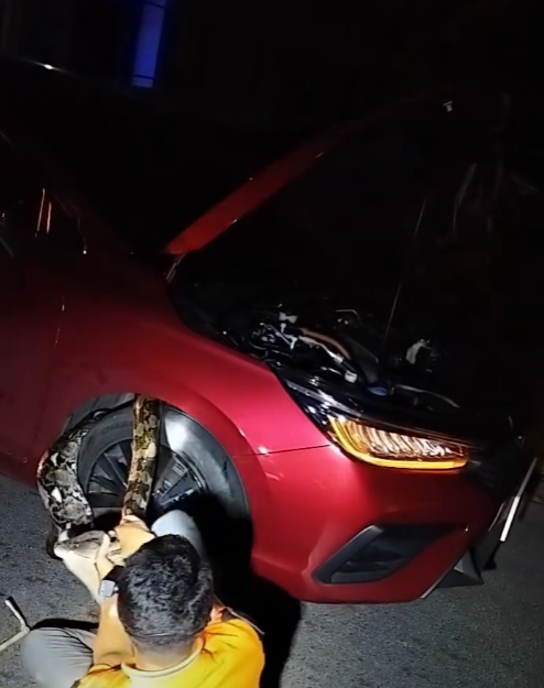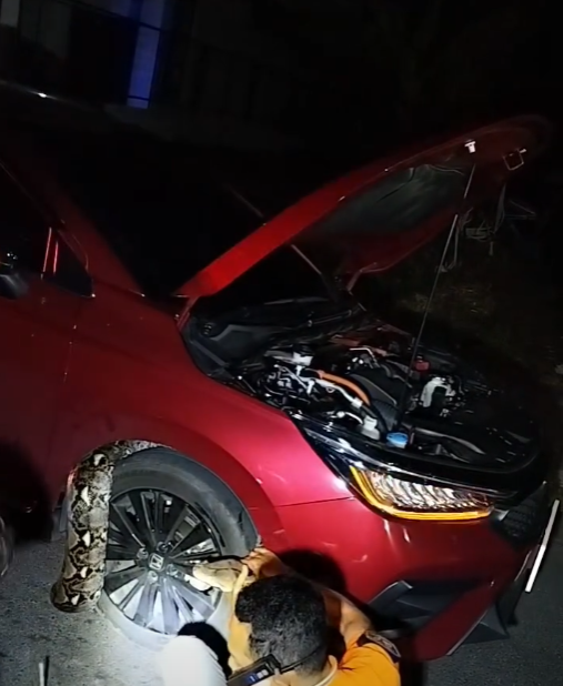 จากการตรวจสอบพบงูเหลือมขนาดใหญ่ ยาวร่วม 4 เมตร นอนขดอยู่ตรงซุ้มล้อหน้าของรถ ทีมงานบังฉา พยายามจะจับงูออกมาอย่างยากลำบาก ใช้เวลาอยู่นานร่วมครึ่ง ชม. จึงนำงูออกมาได้ นำตัวใส่กระสอบไปปล่อยคืนป่า