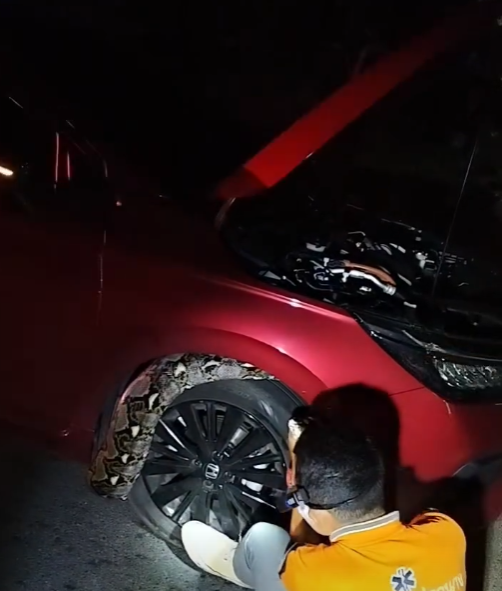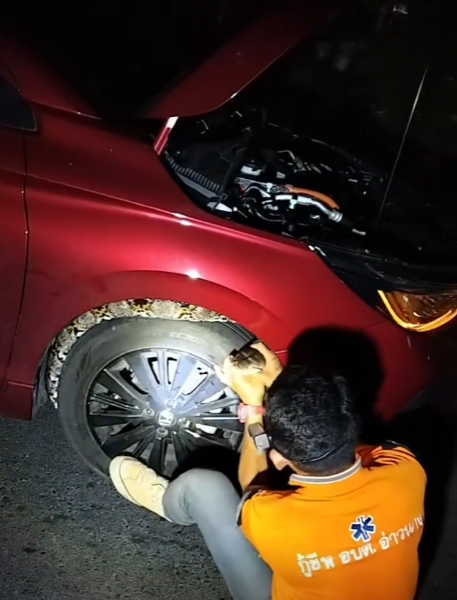 เกือบเท่าล้อรถ! สาวผวาจอดรถข้างทาง งูเหลือมตัวใหญ่ เลื้อยซุกใต้ท้องรถ จนท.เร่งช่วยจับงู
