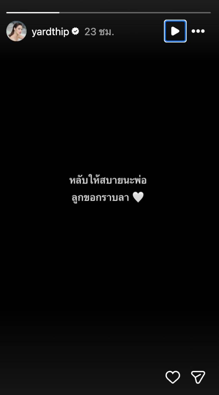 โดยโพสต์ข้อความผ่านไอจีสตอรี่สั้นๆว่า หลับให้สบายนะพ่อ ลูกขอกราบลา