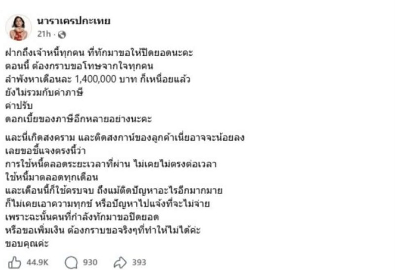 เรียกได้ว่า ดราม่าหนี้ของ นารา กลับมาร้อนอีกระลอก หลัง เจ้าตัว ออกมาชี้แจงละเอียดยิบ ถึงเหตุผลที่ยังชำระหนี้ในวงเงินจำกัด แม้ต้องแบกรับภาระก้อนโตหลายด้านพร้อมกัน