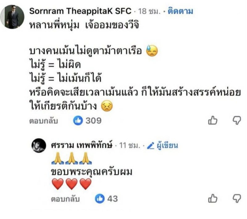 นอกจากนี้ เจ้าตัว ยังตอบกลับอีกหลายข้อความแบบตรงไปตรงมา หลังมีคนเข้ามาคอมเมนต์วิจารณ์เกินขอบเขต พร้อมทิ้งมุมมองว่า หากไม่รู้ข้อเท็จจริง ก็ควรเลือกไม่แสดงความเห็น หรือ อย่างน้อยควรคอมเมนต์อย่างสร้างสรรค์ และให้เกียรติกัน