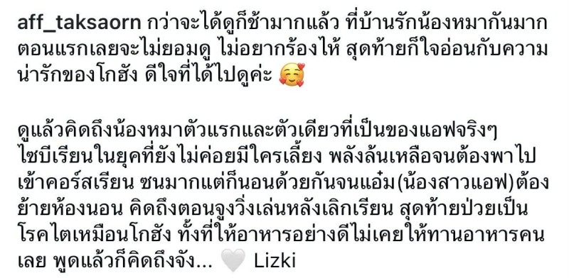 ซึ่ง แอฟ ได้เล่าความรู้สึกผ่านแคปชั่นสุดซึ้งถึง Lizki ว่า เป็นสุนัขตัวแรก และตัวเดียวที่เธอ เคยเลี้ยงอย่างจริงจัง พร้อมย้อนถึงช่วงเวลาที่เติบโตมาด้วยกัน ทั้งความซน ความน่ารัก และกิจวัตรที่เคยใช้ชีวิตร่วมกันในวัยเรียน