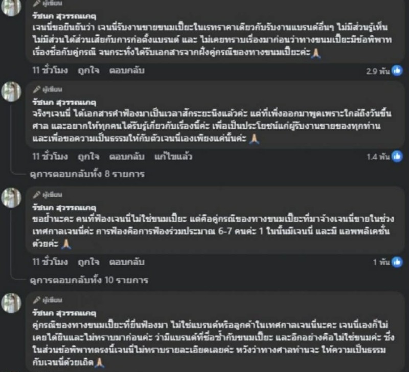 โดย เจนนี่ ระบุว่า ตัวเองเป็นเพียงผู้รับจ้างรีวิวสินค้า รับงานในอัตราปกติเหมือนแบรนด์อื่น ไม่มีส่วนเกี่ยวข้องกับเจ้าของแบรนด์ การก่อตั้งธุรกิจ หรือข้อพิพาทเรื่องชื่อทางการค้า และเพิ่งมารับรู้ปัญหาหลังได้รับเอกสารฟ้องร้อง