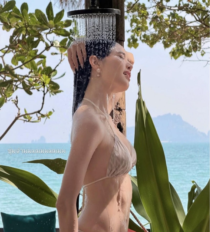 งานนี้ เธอ มาในชุดบิกินี่ตัวจิ๋ว ดีไซน์จากผ้าไทย รูปลักษณ์สุดโดดเด่น เฉพาะช็อตยืนอาบน้ำริมทะเลที่หลายคนยกให้เป็นซีนเด็ดสุดฮอต
