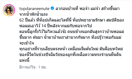 ท่ามกลางแฟนๆเเละคนในวงการต่างส่งกำลังใจสำหรับนักแสดงรุ่นใหญ่ ท็อป ดารณีนุช หลังทำใจทุบบ้านที่พ่อและแม่สร้างขึ้นมาด้วยน้ำพักน้ำแรงเมื่อ 62 โดยระบุว่า ลาก่อนบ้านที่ พ่อจ๋า แม่จ๋า สร้างขึ้นมาจากน้ำพักน้ำแรง 62 ปีแล้ว