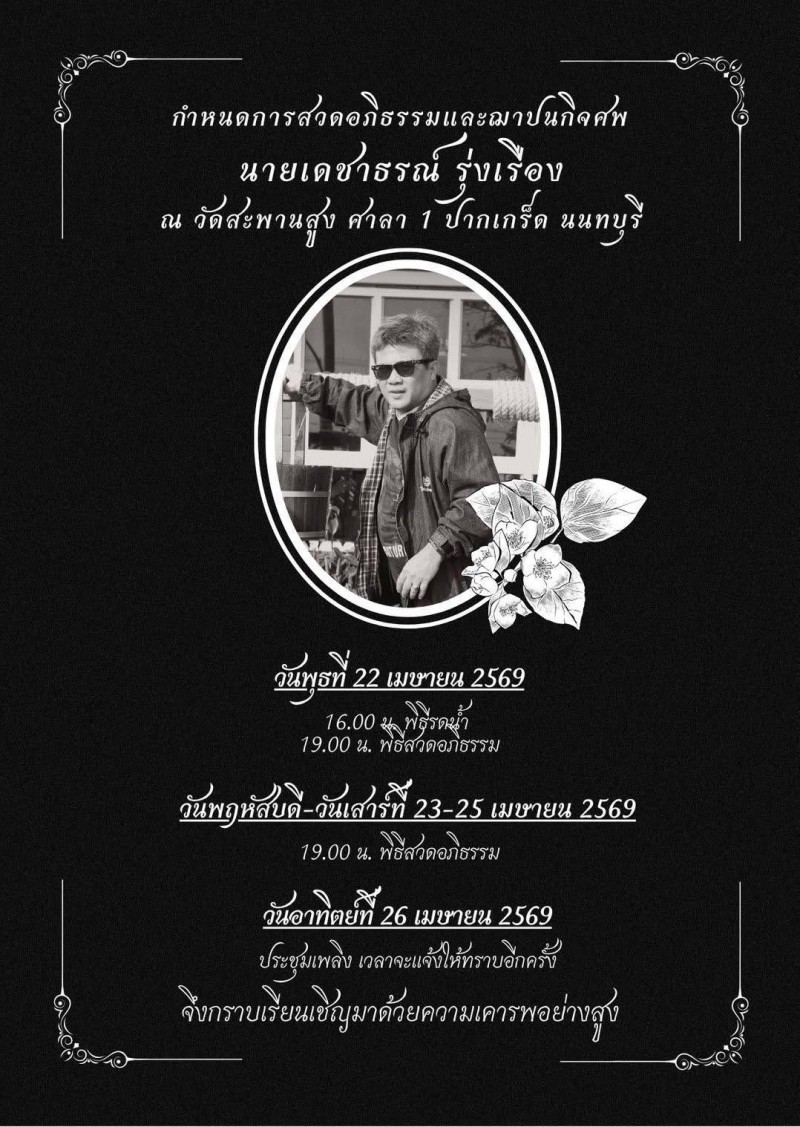 วันที่ 22 เม.ย. 69 พิธีรดน้ำ เวลา 16.00 น. สวดพระอภิธรรม เวลา 19.00 น.