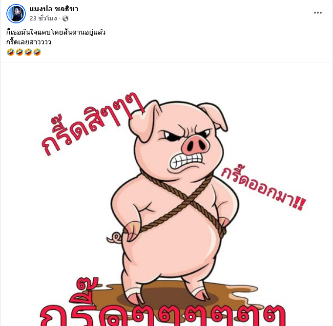 กลายเป็นเรื่องราวสะเทือนวงการตลกเมื่อล่าสุดนักร้องสาว แมงปอ ชลธิชา ได้โพสต์ข้อความ ก็เธอมันใจแคบโดยสันดานอยู่แล้ว กรี๊ดเลยสาววววพร้อมแนบภาพการ์ตูนรูปหมูกรี๊ด