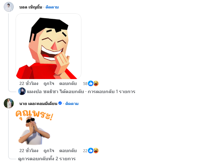 ต่อมามีเพื่อนในวงการตลกและแฟนๆต่างเข้ามาคอมเมนต์กันอย่างมาก บอล เชิญยิ้ม เข้ามาโพสต์รูปตัวการ์ตูนหัวเราะ ด้านป๋าชู วัดเศวต เข้ามาคอมเมนต์ งานมาอีกดิ อุตส่าห์เงียบแล้วนะเห้อ ซึ่งแมงปอตอบป๋าชูว่า ปล่อยให้พรั่งพรูออกมาเลยค่ะ นาย เดอะคอมเมเดี้ยน เข้ามาโพสต์รูปตัวการ์ตูนที่ร้องว่าคุณพระ