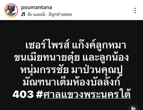 ปู มัณฑนา ได้โพสต์ไอจีส่วนตัวระบุว่า เซอร์ไพรส์ แก๊งค์ลูกหมาขนเมียทนายตุ๋ย และลูกน้องหนุ่ม กรรชัย มาป่วนคุณปู มัณฑนา เต็มห้องบัลลังก์ 403 #ศาลแขวงพระนครใต้ พร้อมทั้งใส่เพลง อีลูกช่างสอด ศิลปิน จ๊ะ นงผณี