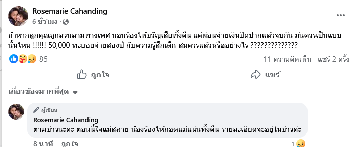 ทำเอาแฟนๆต่างตกใจกันอย่างมากเมื่อล่าสุดอดีตนักร้องสาว โรสแมรี่ คาฮันดิง ได้ออกมาโพสต์ข้อความระบุว่า ถ้าหากลูกคุณถูกลวนลามทางเพศ นอนร้องไห้ขวัญเสียทั้งคืน แค่ผ่อนจ่ายเงินปิดปากแล้วจบกัน มันควรเป็นแบบนั้นไหม !!!!!! 50,000 ทยอยจ่ายสองปี กับความรู้สึกเด็ก สมควรแล้วหรืออย่างไร ??????????????