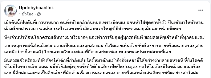 นี่ยังโชคดีที่ไม่มีใครบาดเจ็บ แต่ตอนนี้บัวก็สะดุ้งทุกครั้งที่ได้ยินเสียงเปิดปิดประตูค่ะ ขอให้ไม่ต้องมีใครต้องมาเจอเรื่องแบบนี้อีกค่ะ และขอเป็นอีกเสียงที่คัดค้านเรื่องการครอบครอง ขายหรือเสพสิ่งเสพติดทุกชนิดอย่างสุดใจค่ะ
