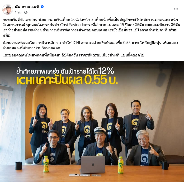 ผมและพนักงานอิชิตัน เราก้าวข้ามอุปสรรคต่างๆ ด้วยการบริหารจัดการอย่างรอบคอบเสมอ เรายังเชื่อมั่นว่า มีโอกาสสำหรับคนที่เตรียมพร้อม ด้วยความเข้มงวดในการบริหารจัดการ ทำให้ ICHI สามารถจ่ายเงินปันผลเพิ่ม 0.55 บาท ให้กับผู้ถือหุ้น เพื่อแสดงคำขอบคุณที่เดินทางร่วมกันมาตลอด และขอบคุณคนไทยทุกคนที่สนับสนุนอิชิตันครับ เราจะสู้และอยู่เคียงข้างกันแบบนี้ตลอดไป