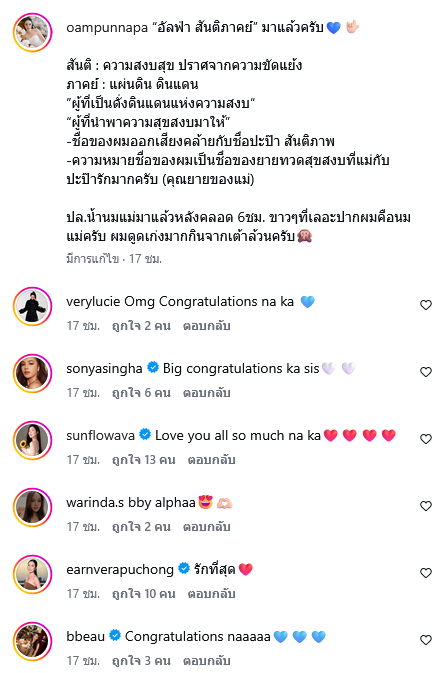 ถือว่าเป็นข่าวดีของครอบครัวเมื่อล่าสุด อ๋อม ปุณณภา วีระภุชงค์ พี่สาวของ เอวา ปวรวรรณ ได้ให้กำเนิดลูกคนแรกเป็นที่เรียบร้อย พร้อมเขียนความหมายชื่อของลูกว่า อัลฟ่า สันติภาคย์ มาแล้วครับ